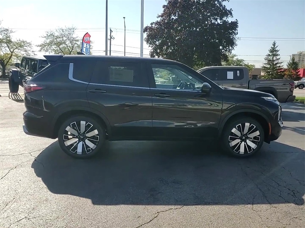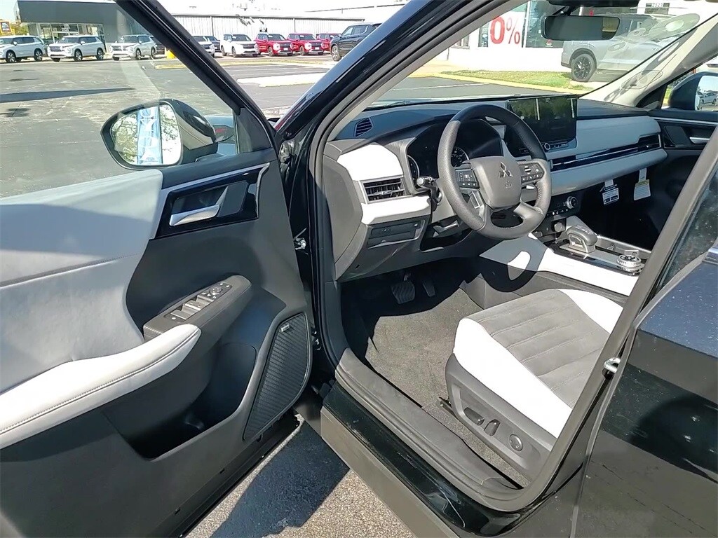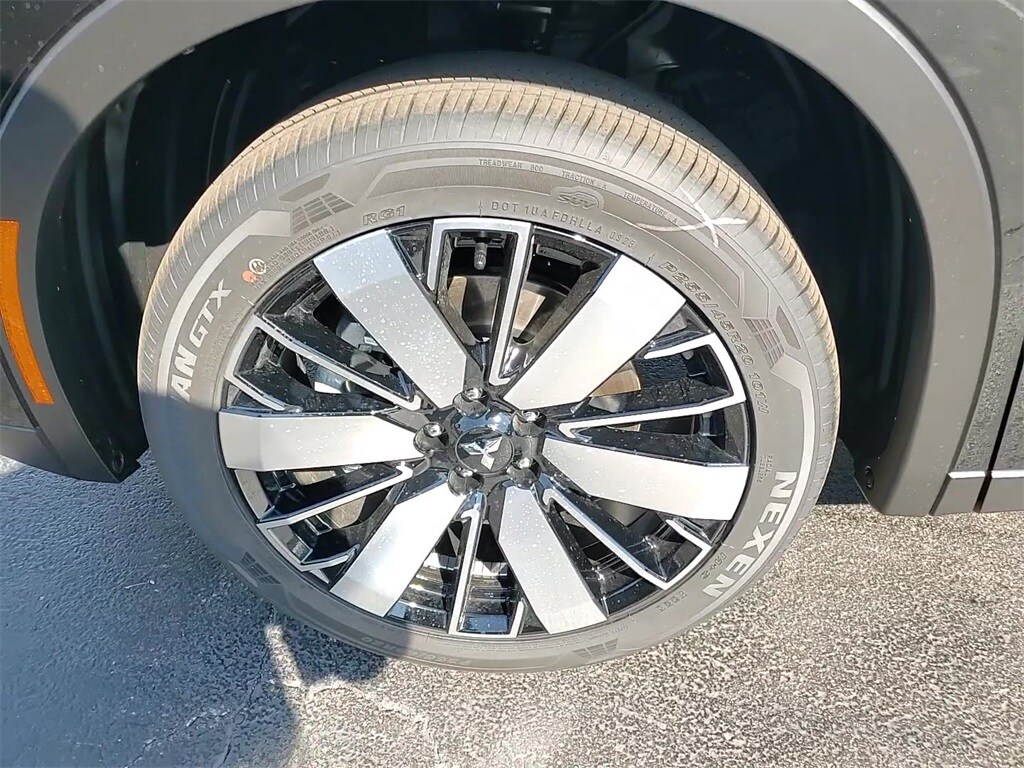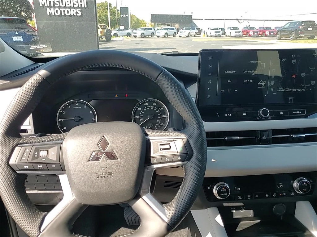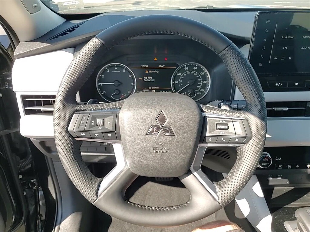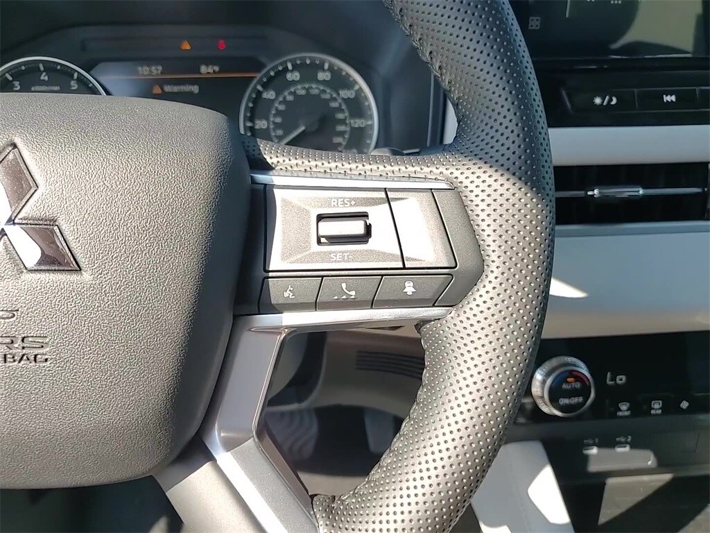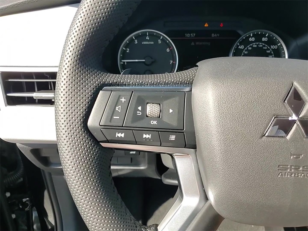 This vehicle comes equipped with 4WD, 3rd row seats: split-bench, 4-Wheel Disc Brakes, 8 Speakers, ABS brakes, Air Conditioning, Alloy wheels, AM/FM radio: SiriusXM, Android Auto & Apple CarPlay, Auto High-beam Headlights, Auto-dimming Rear-View mirror, Automatic temperature control, Brake assist, Bumpers: body-color, Driver door bin, Driver vanity mirror, Dual front impact airbags, Dual front side impact airbags, Electronic Stability Control, Emergency communication system: Mitsubishi Connect w/ 24-month trial, Exterior Parking Camera Rear, Four wheel independent suspension, Front anti-roll bar, Front Bucket Seats, Front Center Armrest w/Storage, Front dual zone A/C, Front fog lights, Front reading lights, Fully automatic headlights, Garage door transmitter: HomeLink, Headlight cleaning, Heated door mirrors, Heated Front Bucket Seats, Heated front seats, Illuminated entry, Knee airbag, Leather Shift Knob, Leather steering wheel, Low tire pressure warning, Navigation System, Occupant sensing airbag, Outside temperature display, Overhead airbag, Overhead console, Panic alarm, Passenger door bin, Passenger vanity mirror, Power door mirrors, Power driver seat, Power Liftgate, Power steering, Power windows, Radio data system, Radio: AM/FM 12.3" Navigation w/Smartphone-Link, Rain sensing wipers, Rear anti-roll bar, Rear seat center armrest, Rear side impact airbag, Rear window defroster, Rear window wiper, Reclining 3rd row seat, Remote keyless entry, Security system, Speed control, Speed-Sensitive Wipers, Split folding rear seat, Spoiler, Steering wheel mounted audio controls, Synthetic Leather Seating Surfaces, Tachometer, Telescoping steering wheel, Tilt steering wheel, Traction control, Trip computer, Turn signal indicator mirrors, and Variably intermittent wipers