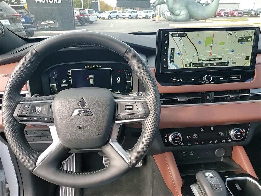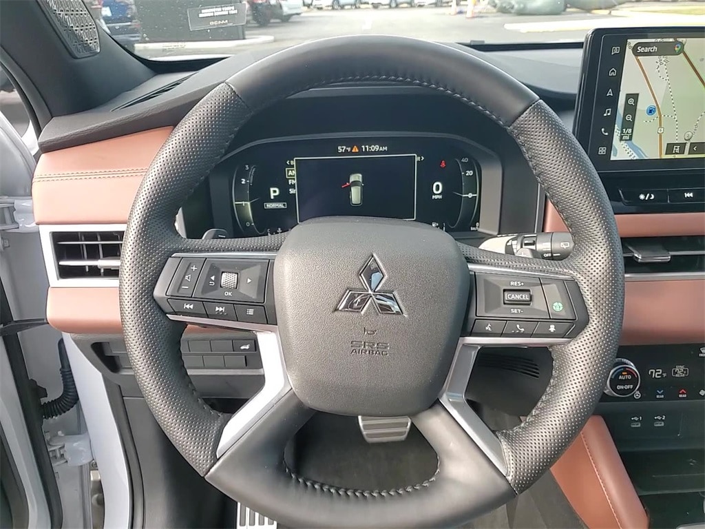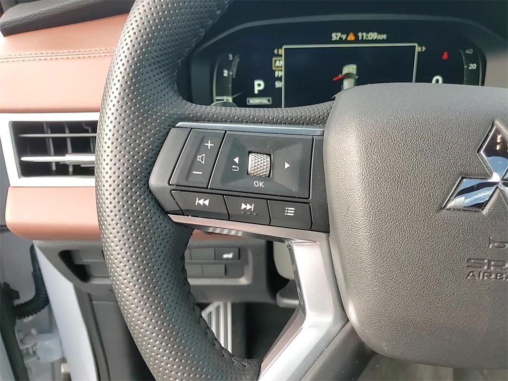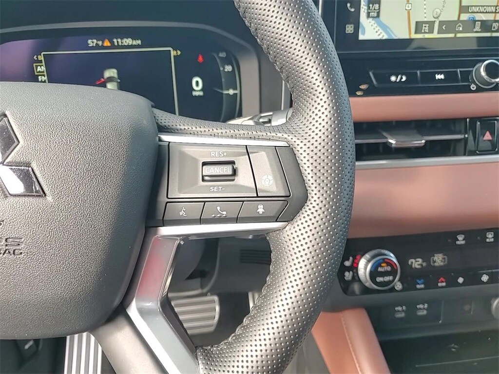This vehicle comes equipped with Welcome Package, 4WD, 3rd row seats: split-bench, 4-Wheel Disc Brakes, ABS brakes, Accessory All-Weather Floor Mats, Accessory Black Wheel Locks & Lug Nuts, Accessory Dynamic Shield Illumination, Accessory Tonneau Cover, Air Conditioning, Alloy wheels, AM/FM radio: SiriusXM, Android Auto & Apple CarPlay, Auto High-beam Headlights, Automatic temperature control, Brake assist, Bumpers: body-color, Driver door bin, Driver vanity mirror, Dual front impact airbags, Dual front side impact airbags, Electronic Stability Control, Emergency communication system: Mitsubishi Connect w/ 24-month trial, Exterior Parking Camera Rear, Four wheel independent suspension, Front anti-roll bar, Front Bucket Seats, Front Center Armrest w/Storage, Front dual zone A/C, Front fog lights, Front reading lights, Fully automatic headlights, Garage door transmitter: HomeLink, Headlight cleaning, Heated door mirrors, Heated front seats, Heated rear seats, Heated steering wheel, Illuminated entry, Knee airbag, Leather Appointed Seating Surfaces, Leather Shift Knob, Leather steering wheel, Low tire pressure warning, Memory seat, Navigation System, Occupant sensing airbag, Outside temperature display, Overhead airbag, Overhead console, Panic alarm, Passenger door bin, Passenger vanity mirror, Power door mirrors, Power driver seat, Power Liftgate, Power moonroof: Panoramic, Power passenger seat, Power steering, Power windows, Radio data system, Radio: AM/FM 12.3" Navigation w/Smartphone-Link, Rain sensing wipers, Rear air conditioning, Rear anti-roll bar, Rear seat center armrest, Rear side impact airbag, Rear window defroster, Rear window wiper, Reclining 3rd row seat, Remote keyless entry, Security system, Speed control, Speed-Sensitive Wipers, Split folding rear seat, Spoiler, Steering wheel mounted audio controls, Tachometer, Telescoping steering wheel, Tilt steering wheel, Traction control, Trip computer, Turn signal indicator mirrors, Variably intermittent wipers, and Wheels: 20" Two-Tone Alloy