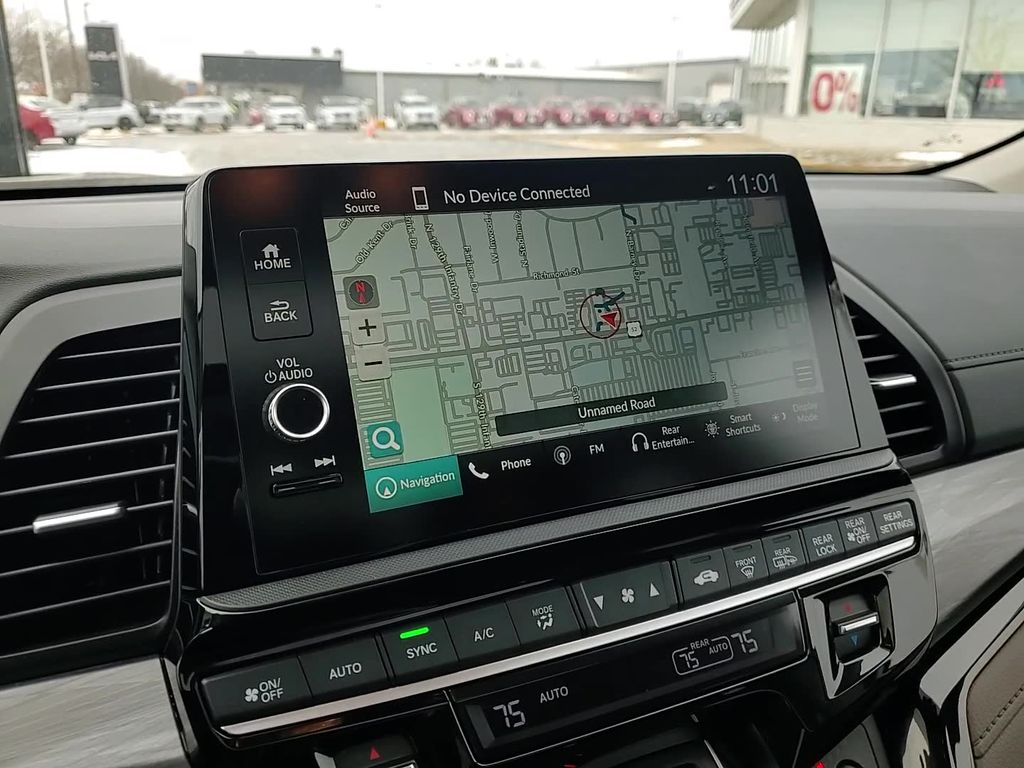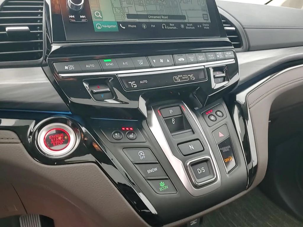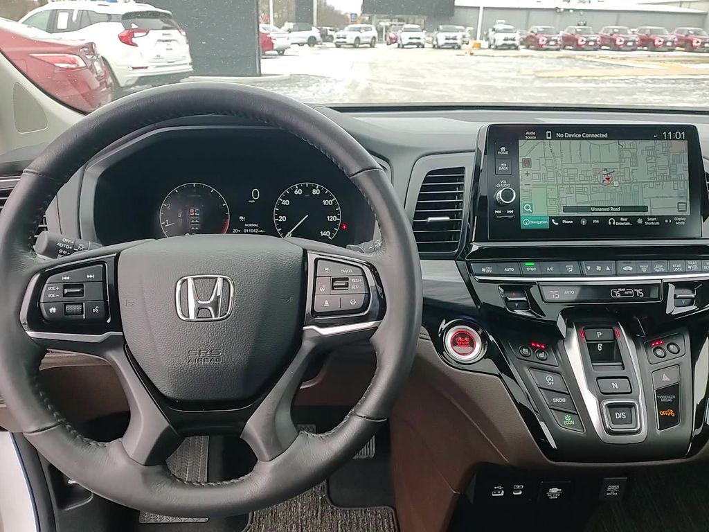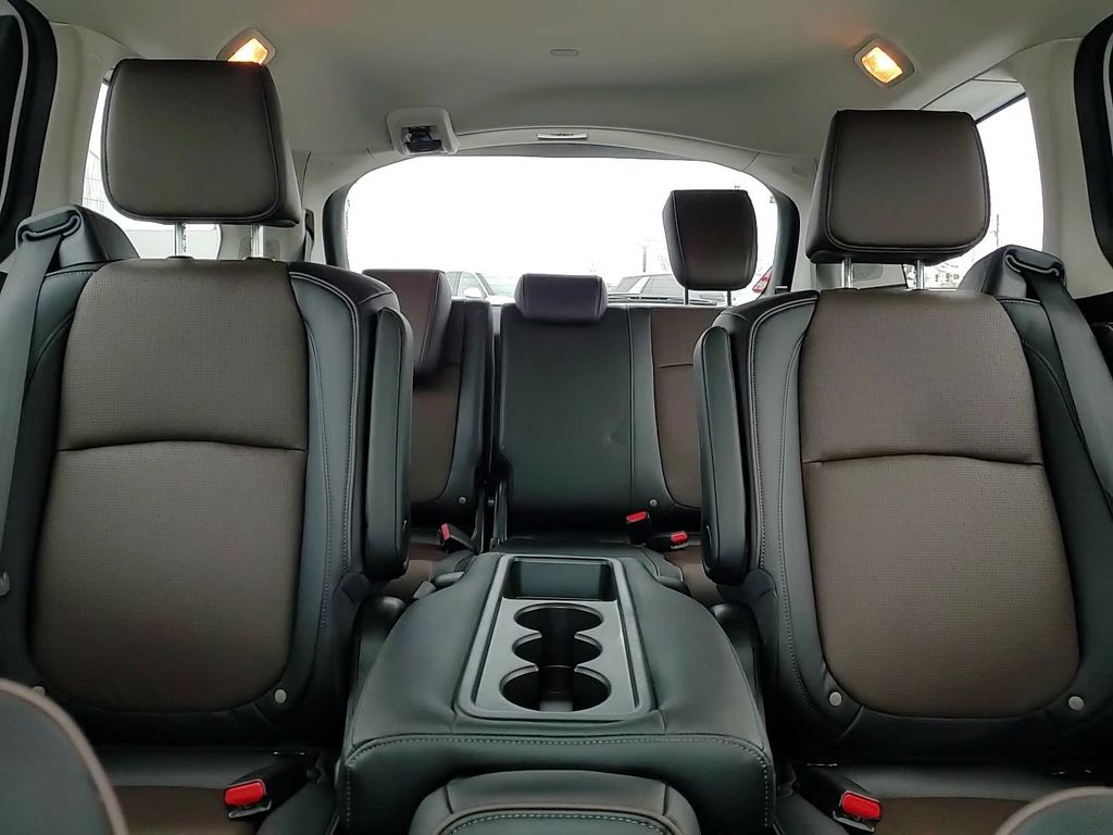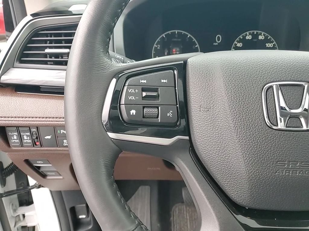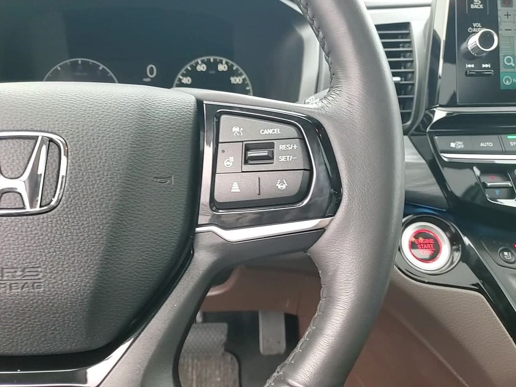 This vehicle comes equipped with 11 Speakers, 3rd row seats: split-bench, 4-Wheel Disc Brakes, ABS brakes, Adaptive Cruise Control: Adaptive Cruise Control (ACC) with Low-Speed Follow, Air Conditioning, Alloy wheels, AM/FM radio: SiriusXM, Anti-whiplash front head restraints, Apple CarPlay/Android Auto, Auto High-beam Headlights, Auto-dimming door mirrors, Auto-dimming Rear-View mirror, Automatic temperature control, Blind Spot Information (BSI) System warning, Brake assist, Bumpers: body-color, Compass, Delay-off headlights, Driver door bin, Driver vanity mirror, Driver's Seat Mounted Armrest, Dual front impact airbags, Dual front side impact airbags, Electronic Stability Control, Emergency communication system: HondaLink, Exterior Parking Camera Rear, Four wheel independent suspension, Front anti-roll bar, Front Bucket Seats, Front dual zone A/C, Front fog lights, Front reading lights, Fully automatic headlights, Garage door transmitter: HomeLink, Heated & Ventilated Front Bucket Seats, Heated door mirrors, Heated front seats, Heated steering wheel, Illuminated entry, Knee airbag, Lane departure: Lane Keeping Assist System (LKAS) active, Leather steering wheel, Low tire pressure warning, Memory seat, Navigation system: Honda Satellite-Linked Navigation System, Occupant sensing airbag, Outside temperature display, Overhead airbag, Overhead console, Panic alarm, Passenger door bin, Passenger seat mounted armrest, Passenger vanity mirror, Perforated Leather Trimmed Seats w/Piping, Power door mirrors, Power driver seat, Power Liftgate, Power moonroof, Power passenger seat, Power steering, Power windows, Radio data system, Radio: 500-Watt AM/FM/HD Premium Audio System, Rain sensing wipers, Rear air conditioning, Rear anti-roll bar, Rear audio controls, Rear reading lights, Rear seat center armrest, Rear window defroster, Rear window wiper, Reclining 3rd row seat, Remote keyless entry, Security system, Speed control, Speed-sensing steering, Speed-Sensitive Wipers, Split folding rear seat, Spoiler, Steering wheel mounted audio controls, Tachometer, Telescoping steering wheel, Tilt steering wheel, Traction control, Trip computer, Turn signal indicator mirrors, Variably intermittent wipers, Ventilated front seats, and Wheels: 19" Machine-Finished Alloy