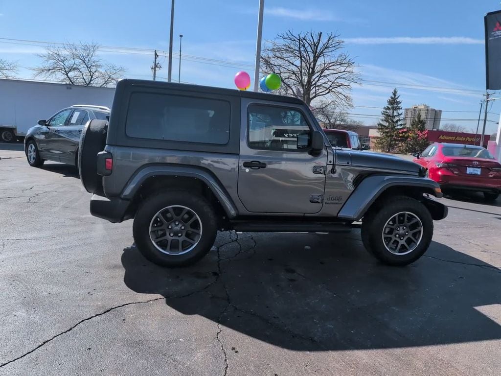 This vehicle comes equipped with 8.4" Radio & Premium Audio Group (1-Yr SiriusXM Guardian Trial, 220 Amp Alternator, 4G LTE Wi-Fi Hot Spot, 5-Year SiriusXM Traffic Service, 5-Year SiriusXM Travel Link Service, 8.4" Touchscreen Display, Air Conditioning w/Auto Temperature Control, Alpine Premium Audio System, Apple CarPlay, Auto-Dimming Rear-View Mirror, Emergency/Assistance Call, For Details, Visit DriveUconnect.com, For More Info Call 800-643-2112, Google Android Auto, GPS Antenna Input, GPS Navigation, HD Radio, Off-Road Info Pages, Radio: Uconnect 4C Nav w/8.4" Display, SiriusXM Radio Service, SiriusXM Satellite Radio, SiriusXM Traffic Plus, SiriusXM Travel Link, and USB Host Flip), Quick Order Package 22Q 80th Edition (DISC) (110 mph Vehicle Max Speed Calibration, Annodized Gunmetal I/P Bezels, Automatic Headlamps, Berber Floor Mats w/80th Anniversary Tag, Body Color Fender Flares, Body Color/Accent Color Grille, Cloth Bucket Seats w/80th Anniversary Tag (DISC), Daytime Running Lamp System, Deep Tint Sunscreen Windows, Front 1-Touch Down Power Windows, Gray/Black Jeep Badges, Gray/Black Trail Rated Badge, Heavy Duty Suspension w/Gas Shocks (DISC), Jeep 80th Anniversary Badges, Jeep 80th Anniversary Console Badge, Jeep 80th Anniversary Oak Keyfob Medallion, Jeep 80th Swing Gate Plaque, Leather Wrapped Steering Wheel, Light Tungsten Interior Accents, Mold In Color Bumper w/Neutral Gray, Power Heated Mirrors, Remote Keyless Entry, Security Alarm, Speed Sensitive Power Locks, Sun Visors w/Illuminated Vanity Mirrors, Wheels: 18" x 7.5" Granite Crystal Aluminum (DISC), and Wrangler Decal), Technology Group (7.0" Touchscreen Display, Air Filtering, Cluster 7.0" TFT Color Display, Integrated Center Stack Radio, and Radio: Uconnect 4 w/7" Display), Trailer Tow & HD Electrical Group (240 Amp Alternator, 7 & 4 Pin Wiring Harness, 700 Amp Maintenance Free Battery, Auxiliary Switches, and Class II Receiver Hitch), 3.45 Rear Axle Ratio, 4-Wheel Disc Brakes, 8 Speakers, ABS brakes, AM/FM radio, Anti-Spin Differential Rear Axle, Black 3-Piece Hard Top, Brake assist, Cloth Low-Back Bucket Seats, Compass, Delay-off headlights, Driver door bin, Driver vanity mirror, Dual front impact airbags, Dual front side impact airbags, Electronic Stability Control, Freedom Panel Storage Bag, Front anti-roll bar, Front Bucket Seats, Front Center Armrest w/Storage, Front fog lights, Front reading lights, Integrated roll-over protection, Low tire pressure warning, Manuf Statement of Origin, Mopar Black Tubular Side Steps, MOPAR Grab Handle Kit, No Soft Top, Normal Duty Suspension, Occupant sensing airbag, Outside temperature display, ParkView Rear Back-Up Camera, Passenger door bin, Passenger vanity mirror, Power steering, R1234YF A/C Refrigerant, Radio data system, Radio: Uconnect 3 w/5" Display, Rear anti-roll bar, Rear reading lights, Rear Window Defroster, Rear Window Wiper/Washer, Speed control, Steering wheel mounted audio controls, Tachometer, Telescoping steering wheel, Tilt steering wheel, Traction control, Trip computer, Variably intermittent wipers, and Wheels: 17" x 7.5" Black Steel Styled