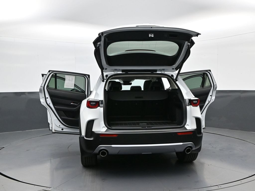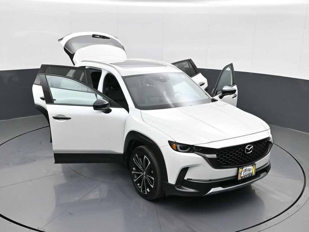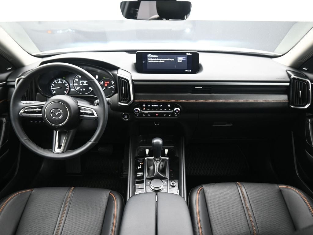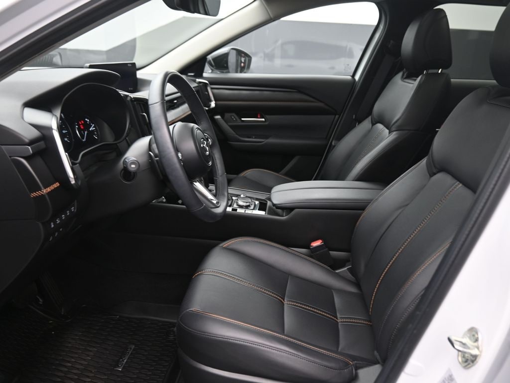 Weather Package (Cargo Liner w/Seatback Protection), 12 Speakers, 20" x 8J Aluminum Alloy Wheels, 3.841 Axle Ratio, 4-Wheel Disc Brakes, ABS brakes, Air Conditioning, Alloy wheels, AM/FM radio: SiriusXM, AppLink/Apple CarPlay and Android Auto, Auto High-beam Headlights, Auto-dimming door mirrors, Auto-dimming Rear-View mirror, Automatic temperature control, Black Lug Nuts & Black Wheel Locks, Brake assist, Bumpers: body-color, Compass, Delay-off headlights, Driver door bin, Driver vanity mirror, Dual front impact airbags, Dual front side impact airbags, Electronic Stability Control, Emergency communication system: MAZDA CONNECT, Front & Rear Splash Guards, Front anti-roll bar, Front Bucket Seats, Front Center Armrest, Front dual zone A/C, Front reading lights, Front wheel independent suspension, Fully automatic headlights, Garage door transmitter: HomeLink, Heads-Up Display, Heated & Ventilated Front Bucket Seats, Heated door mirrors, Heated front seats, Heated rear seats, Heated steering wheel, Illuminated entry, Knee airbag, Leather Seat Trim, Leather Shift Knob, Leather steering wheel, Low tire pressure warning, Memory seat, Navigation system: MAZDA CONNECT, Occupant sensing airbag, Outside temperature display, Overhead airbag, Overhead console, Panic alarm, Passenger door bin, Passenger vanity mirror, Power door mirrors, Power driver seat, Power Liftgate, Power moonroof, Power passenger seat, Power steering, Power windows, Radio data system, Radio: AM/FM/HD Audio System, Rain sensing wipers, Rear seat center armrest, Rear window defroster, Rear window wiper, Remote keyless entry, Retractable Cargo Cover, Silver Cross Bars, Speed control, Speed-sensing steering, Split folding rear seat, Spoiler, Steering wheel mounted audio controls, Tachometer, Telescoping steering wheel, Tilt steering wheel, Traction control, Trip computer, Turn signal indicator mirrors, Variably intermittent wipers, Ventilated front seats, and Wind Chill Pearl Paint Charge.
