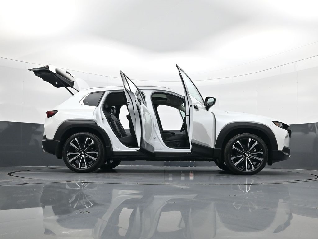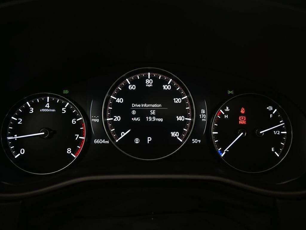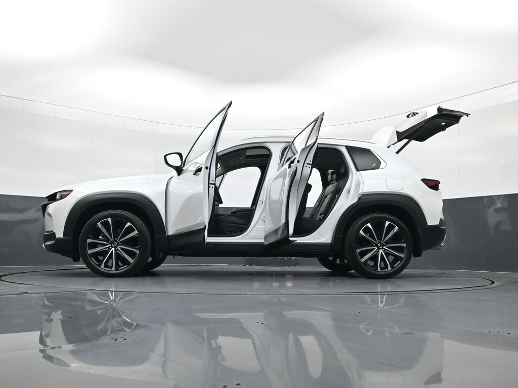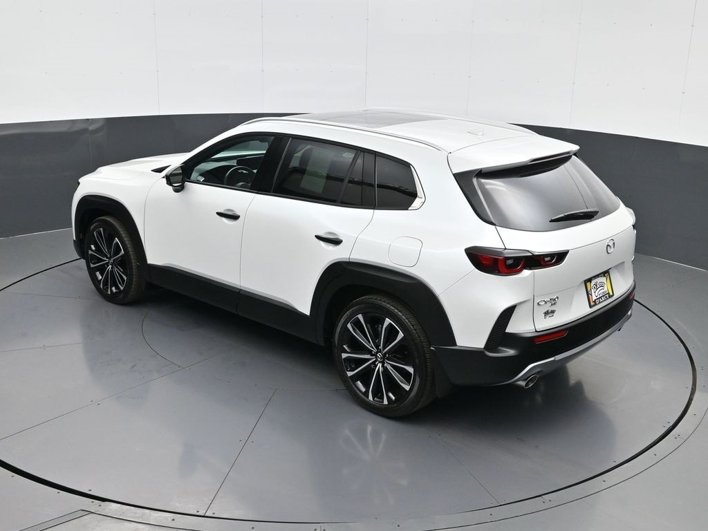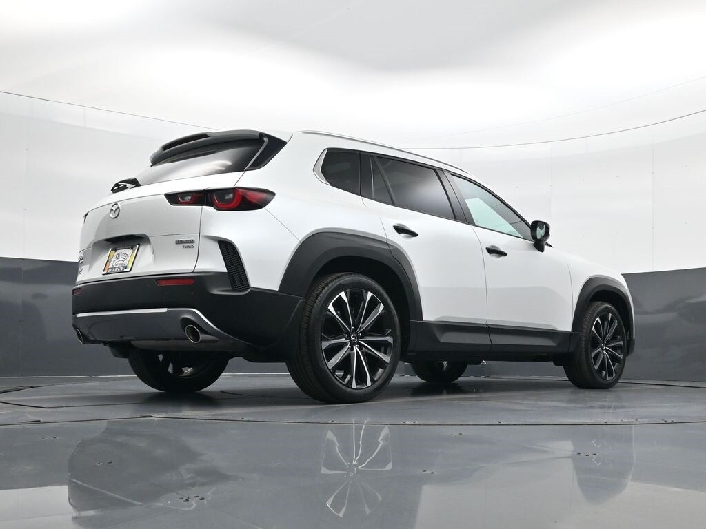 Weather Package (Cargo Liner w/Seatback Protection), 12 Speakers, 20" x 8J Aluminum Alloy Wheels, 3.841 Axle Ratio, 4-Wheel Disc Brakes, ABS brakes, Air Conditioning, Alloy wheels, AM/FM radio: SiriusXM, AppLink/Apple CarPlay and Android Auto, Auto High-beam Headlights, Auto-dimming door mirrors, Auto-dimming Rear-View mirror, Automatic temperature control, Black Lug Nuts & Black Wheel Locks, Brake assist, Bumpers: body-color, Compass, Delay-off headlights, Driver door bin, Driver vanity mirror, Dual front impact airbags, Dual front side impact airbags, Electronic Stability Control, Emergency communication system: MAZDA CONNECT, Front & Rear Splash Guards, Front anti-roll bar, Front Bucket Seats, Front Center Armrest, Front dual zone A/C, Front reading lights, Front wheel independent suspension, Fully automatic headlights, Garage door transmitter: HomeLink, Heads-Up Display, Heated & Ventilated Front Bucket Seats, Heated door mirrors, Heated front seats, Heated rear seats, Heated steering wheel, Illuminated entry, Knee airbag, Leather Seat Trim, Leather Shift Knob, Leather steering wheel, Low tire pressure warning, Memory seat, Navigation system: MAZDA CONNECT, Occupant sensing airbag, Outside temperature display, Overhead airbag, Overhead console, Panic alarm, Passenger door bin, Passenger vanity mirror, Power door mirrors, Power driver seat, Power Liftgate, Power moonroof, Power passenger seat, Power steering, Power windows, Radio data system, Radio: AM/FM/HD Audio System, Rain sensing wipers, Rear seat center armrest, Rear window defroster, Rear window wiper, Remote keyless entry, Retractable Cargo Cover, Silver Cross Bars, Speed control, Speed-sensing steering, Split folding rear seat, Spoiler, Steering wheel mounted audio controls, Tachometer, Telescoping steering wheel, Tilt steering wheel, Traction control, Trip computer, Turn signal indicator mirrors, Variably intermittent wipers, Ventilated front seats, and Wind Chill Pearl Paint Charge.